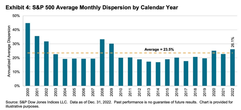 Aktive forvalteres chance for succes stiger, når korrelationen – et mål for hvordan aktier bevæger sig i forhold til hinanden – er lav, da dette indikerer, at det er virksomhedsspecifikke faktorer snarere end makroøkonomiske forhold, der driver afkastet. Endnu mere vigtigt er imidlertid spredningen – altså i hvor meget aktierne bevæger sig sammenlignet med gennemsnittet af markedet. Her indikerer stor spredning en bedre mulighed for at slå (men også for at underpræstere!) markedet. I 2022 var aktiespredningen blandt selskaberne i S&P 500 på sit højeste siden 2009, hvilket skabte gode forhold for aktive forvaltere, der kunne praktisere succesfuld aktieudvælgelse.