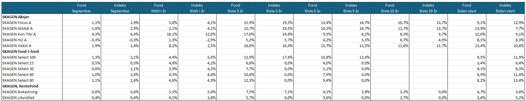 Etter et sterkt første halvår underpresterte fondet i tredje kvartal. SKAGEN Global falt 2,7 prosent tilbake mens indeksen sted 6,1 prosent i kvartalet i lokal valuta. Se flere avkastningstall nederst i artikkelen.