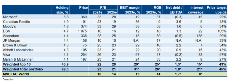 Though we frequently emphasise the need for solid cash flow and healthy balance sheets, the composition of the fund is intended to give the portfolio both offensive and defensive qualities while delivering attractive long-term returns. As detailed above, SKAGEN Global has delivered 12% return per year over the past five years (in EUR). The table below shows our top-10 list with select metrics as of 30 November 2023. The weighted-average portfolio upside over the next few years is 45%, demonstrating that our financial analysis indicates there is still substantial upside in the fund going forward.