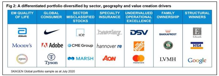 I denne sammenhengen ser porteføljen betydelige undervurdert ut. De 35 postene har en vektet oppside på 34 prosent, basert på dagens kursmål over en to-årshorisont. Verdensindeksen MSCI All Country World Index handles til sammenligning til 47 prosent og 28 prosent over 15-års gjennomsnitt basert på hhv P/E og P/B - tross nedsiderisikoen ved den økonomiske innhentingen[10]. Forvalterne har en pragmatisk tilnærming til verdiforvaltning og ser forbi selskaper som kan se billige ut, basert på gamle verdsettelsesmodeller som ikke lenger passer i en verden som i stadig større grad preges av immaterielle verdier, som beskrevet i en tidligere artikkel.
