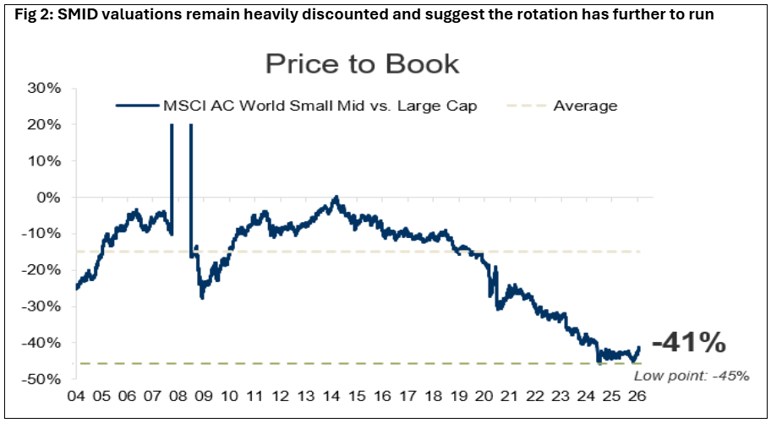 Värderingsgapet mellan globala små och stora bolag är fortsatt stort i ett historiskt perspektiv, där småbolag handlas med rabatter på omkring 40 % respektive 15 % baserat på multiplar för bokfört värde och vinster. Det talar för att rotationen har mer att ge och kan få ytterligare fart. Intressant att notera är att småbolag ofta och under långa perioder handlats med premie jämfört med större bolag.