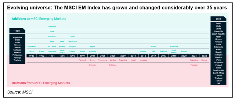 Detta illustrerar utmaningen med att investera passivt i en mycket sammansatt grupp av 24 länder, som i allt större utsträckning har mer som skiljer dem än som förenar dem. Begreppet "tillväxtmarknader" dök först upp 1981 för att locka investeringar till det man då kallade "tredje världens"-ekonomier. När MSCI lanserade sitt första EM-index sju år senare för att möta efterfrågan på snabbt växande ekonomier med ökande levnadsstandard och globaliserad handel, var situationen helt annorlunda. Sedan dess har antalet länder i indexet mer än fördubblats, med frekventa in- och utträden (Argentina har till exempel pendlat ut och in flera gånger).