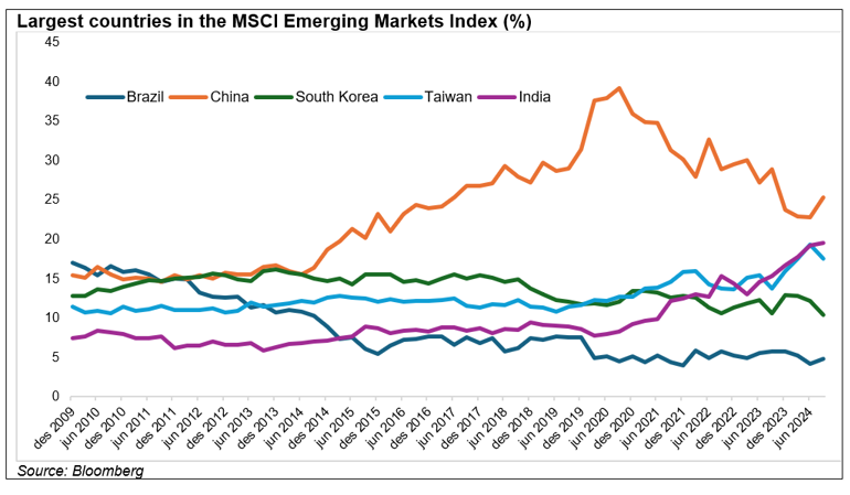 Kina, som först kom med i indexet 1996, har i över 15 år varit det största enskilda landet i EM-indexet. Landet står nu för 27 procent av investeringsuniversumet, ner från cirka 40 procent under pandemin, men fortfarande tillräckligt stort för att ha betydande inflytande.